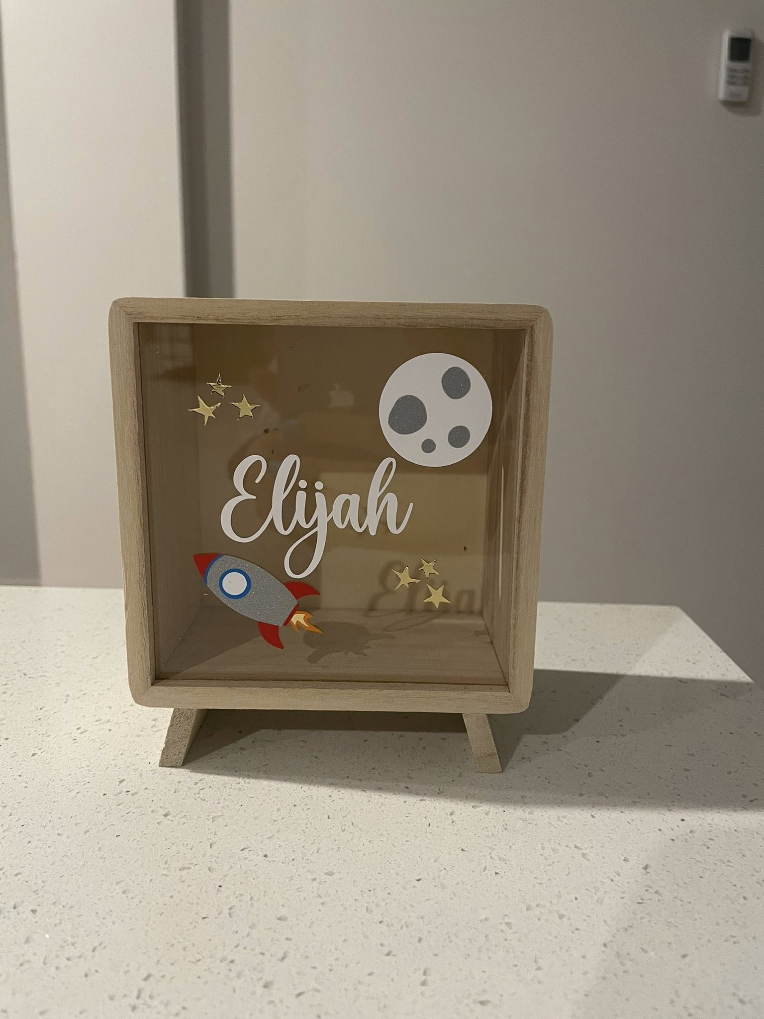 A personalized money box featuring a colourful theme which can be selected from the options.